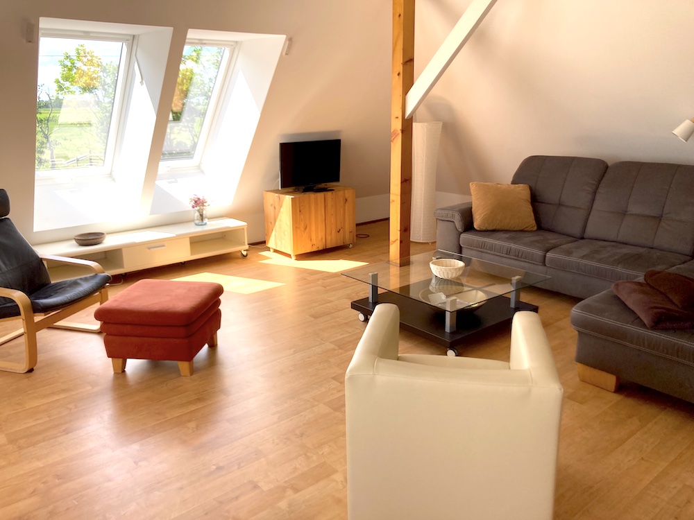 Genießen Sie auf der gemütlichen Sofalandschaft den Ausblick durch die großen Dachfenster und die Ruhe und Atmosphäre der Wohnung und Umgebung.