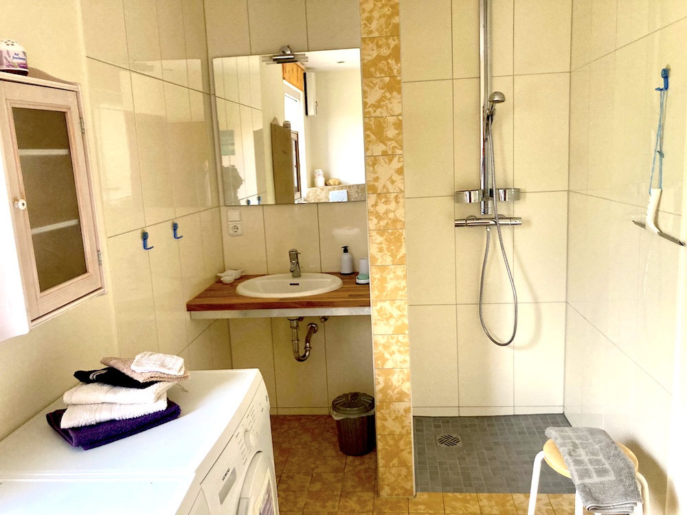Im Erdgeschoss befindet sich das großzügige Badezimmer mit barrierefreier, offener Dusche, einem WC, Waschbecken, sowie einer Waschmaschine und einem Trockner. Natürlich können Sie Ihre Wäsche auch ganz Umweltschonend im Garten an der frischen Luft auf dem bereitgestellten Wäscheständer trocknen.