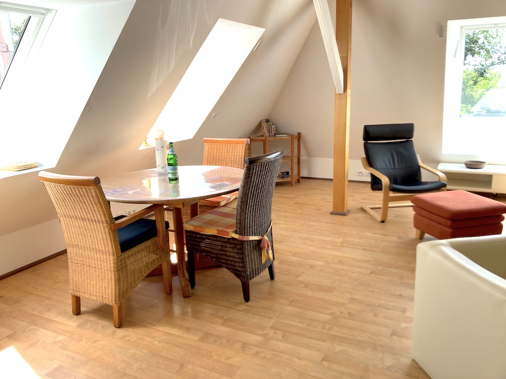 Genießen Sie auf der gemütlichen Sofalandschaft den Ausblick durch die großen Dachfenster und die Ruhe und Atmosphäre der Wohnung und Umgebung.