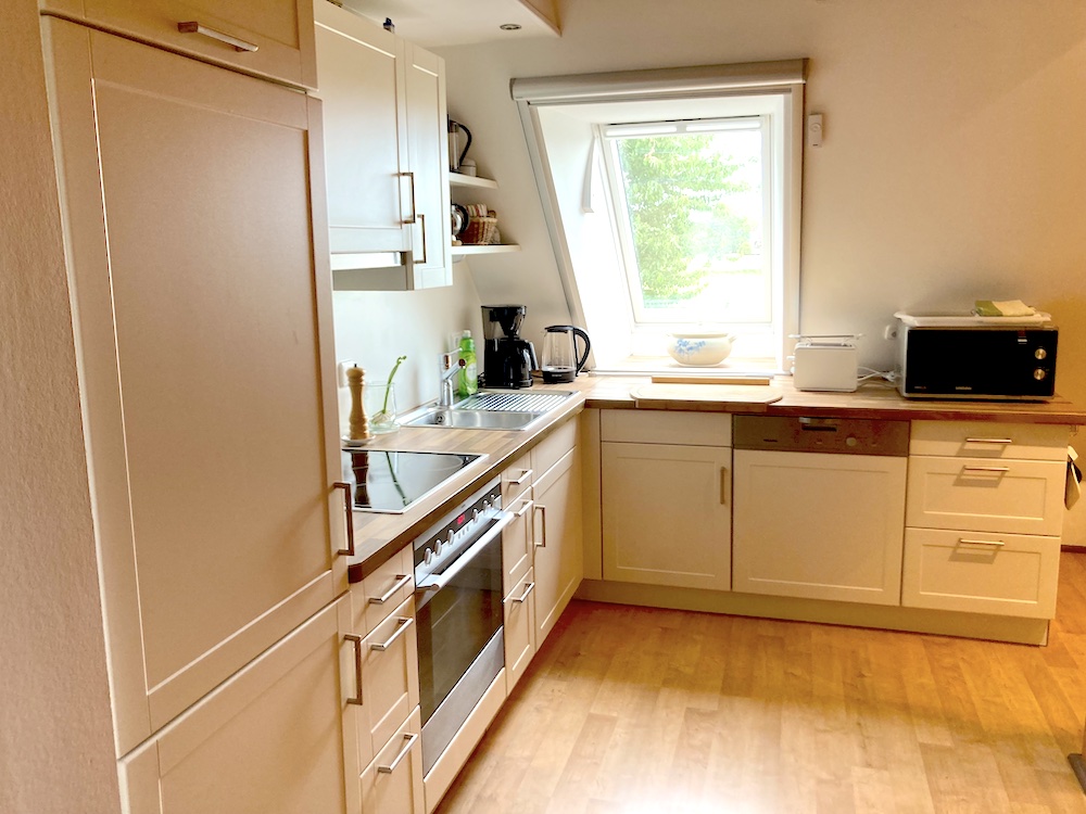 Die Küche ist vom Toaster über eine geräumige Kühl- Gefrierkombination bis hin zur Kaffeemaschine und Mikrowelle mit allen Geräten ausgestattet, die für eine Selbstversorgung benötigt werden.